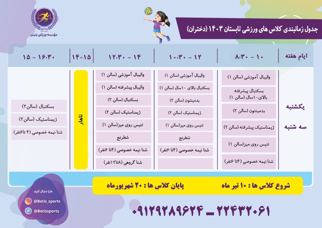 09 خرداد اخبار و اطلاعیه ها زمانبندی کلاسهای ورزشی دختران در تابستان 1403 اعلام شد. 7 خرداد 1403 توسط سحر یزدانبخش 0 نظر موسسه ورزشی بتیس در تابستان سال 1403 کلاسهای ورزشی دختران را در 7 رشته ورزشی برگزار مینماید. این رشتهها شامل موارد زیر است. بسک...ادامه مطلب